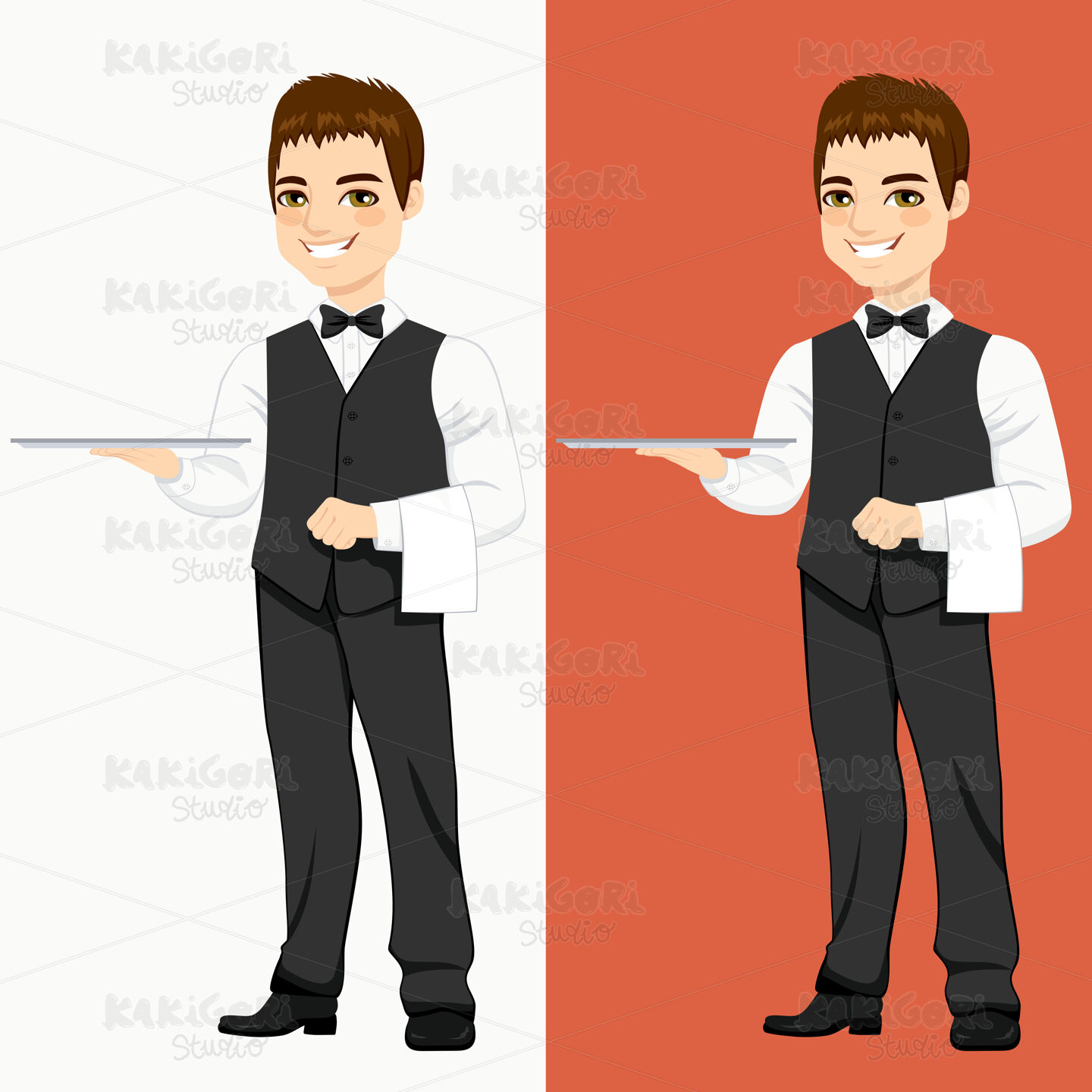 Young handsome waiter standing with empty silver tray in two different color versions
