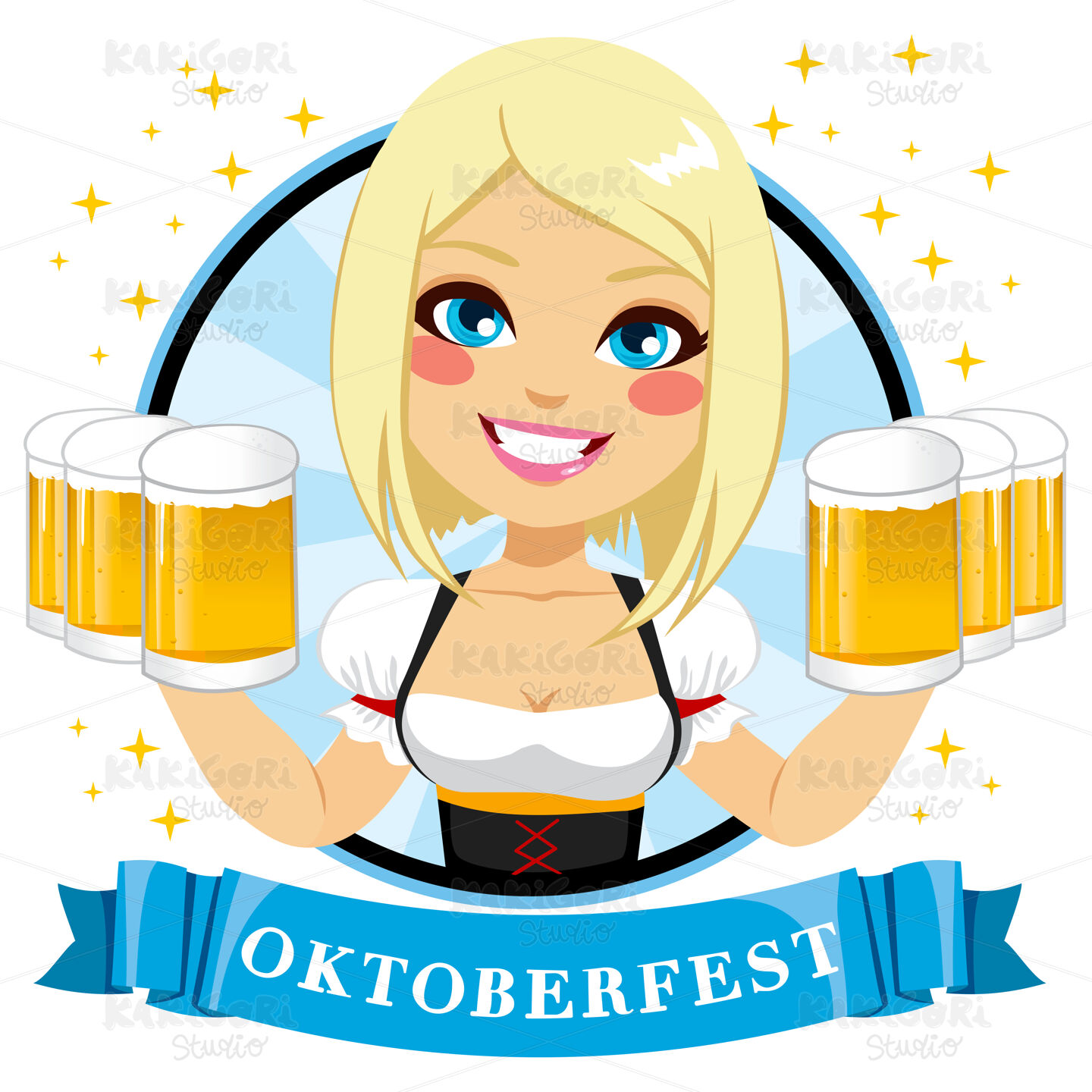 Illustration of beautiful young blonde waitress holding six beer mugs on Oktoberfest celebration