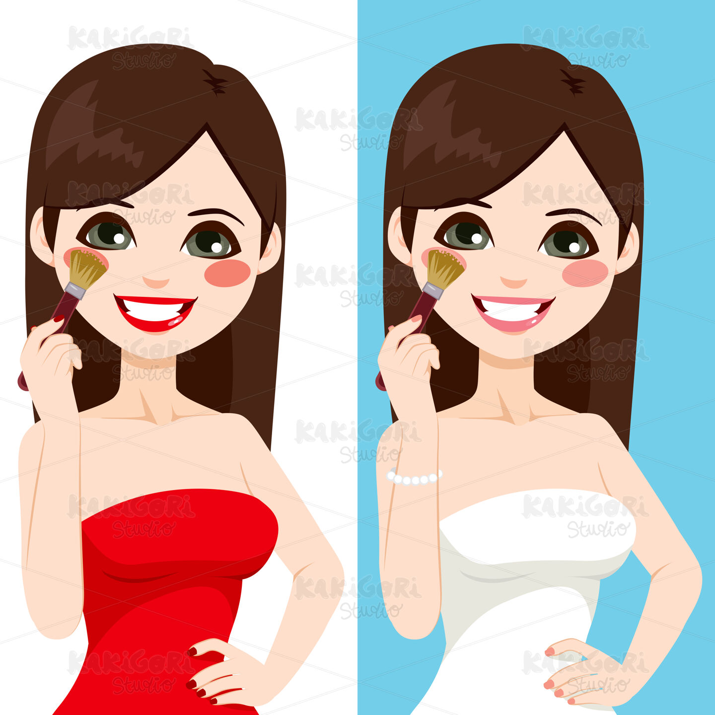 Beautiful brunette young woman applying blush with brush in two different color version isolated on white and blue background