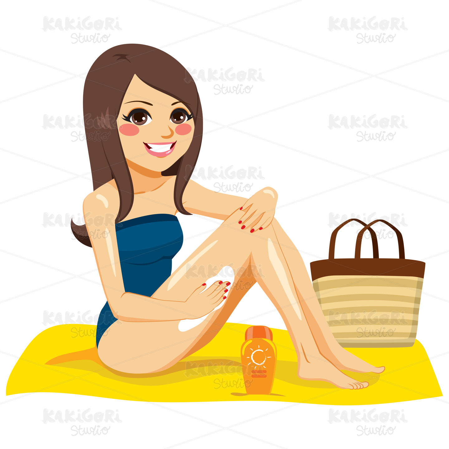 Beautiful young happy brunette woman applying suntan cream on her legs sitting in yellow towel