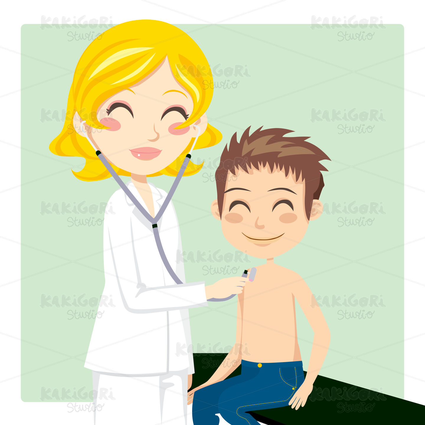 Pretty blond woman doctor examining little boy with stethoscope