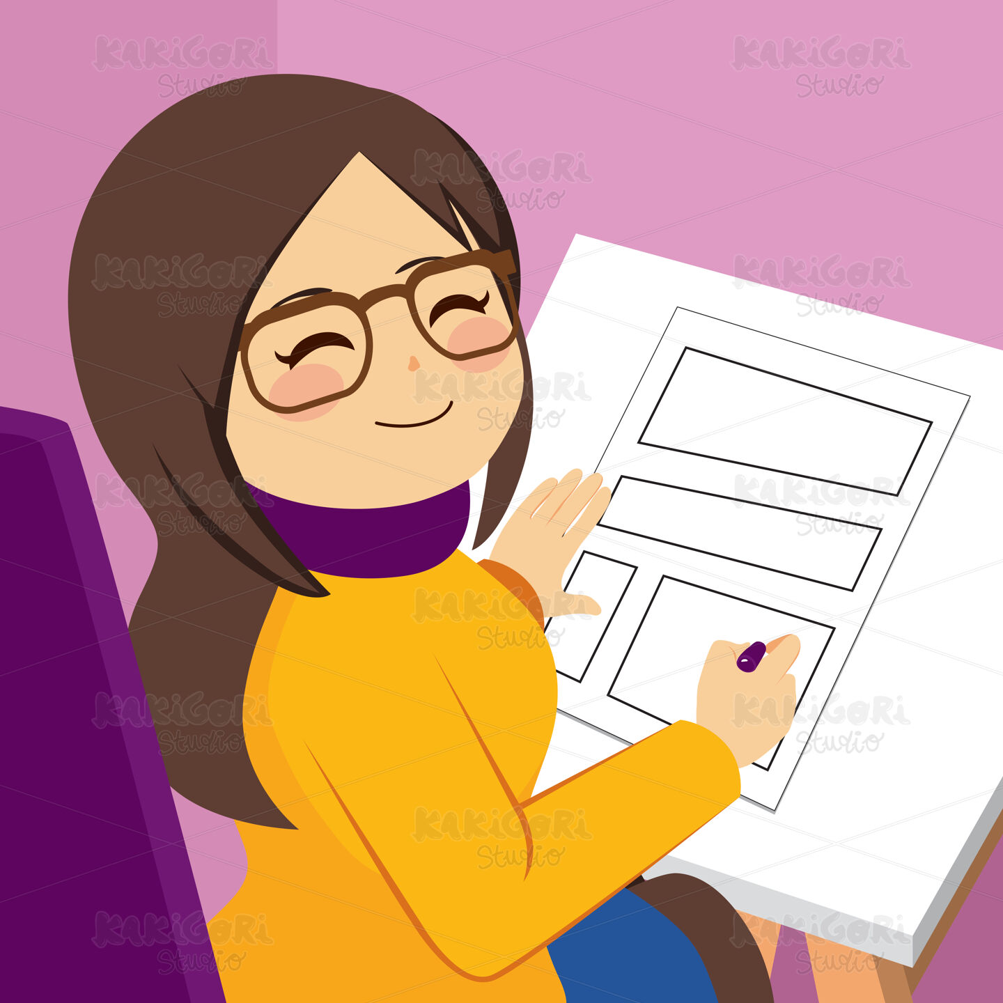 Cute happy professional woman illustrator artist drawing comic
