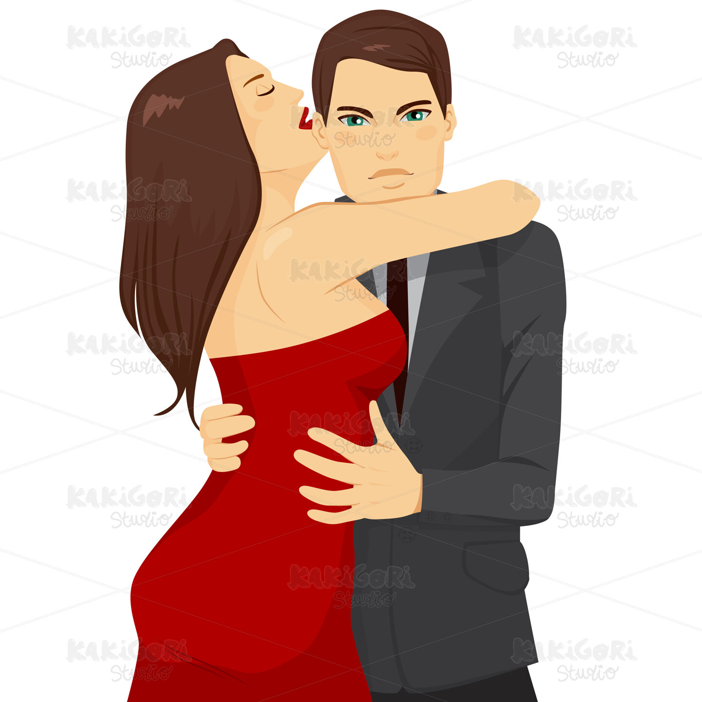Attractive young brunette woman in sexy red dress embracing handsome man wearing gray suit