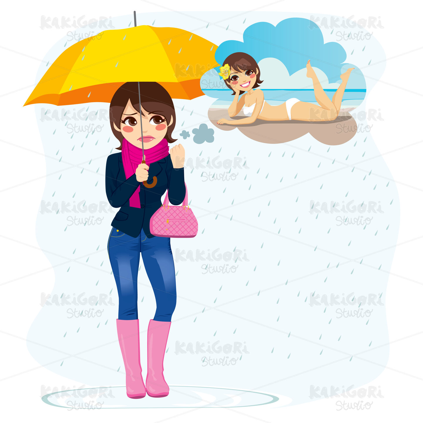 Beautiful sad woman standing in the rain longing for sunny summer beach vacations