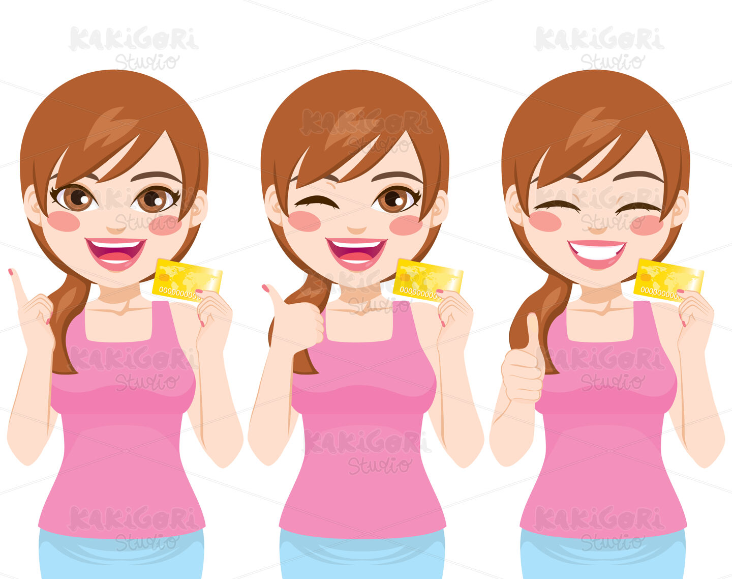 Young beautiful woman holding credit card on three different action with positive face expression