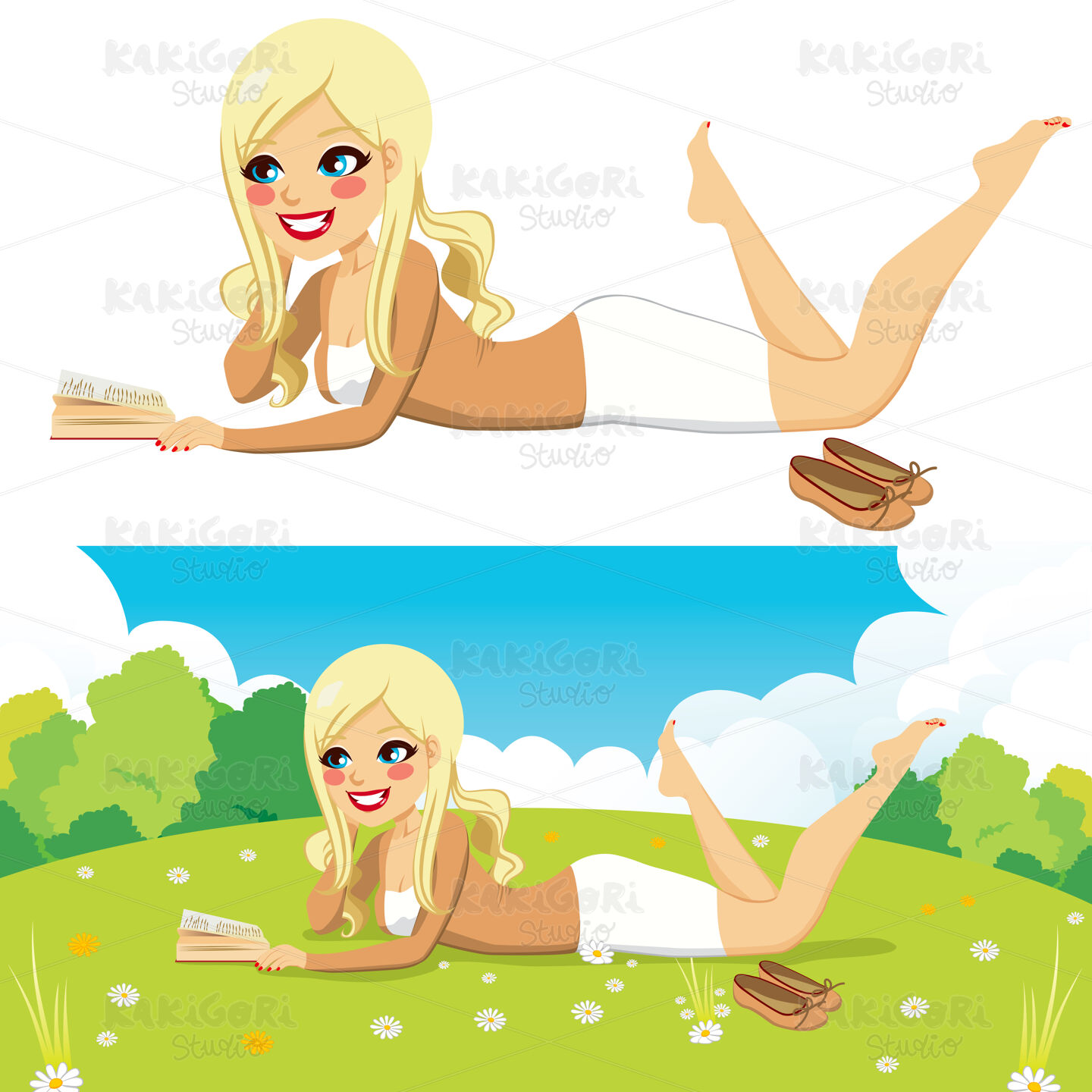 Beautiful blonde woman lying down on grass reading a book on peaceful park with flowers