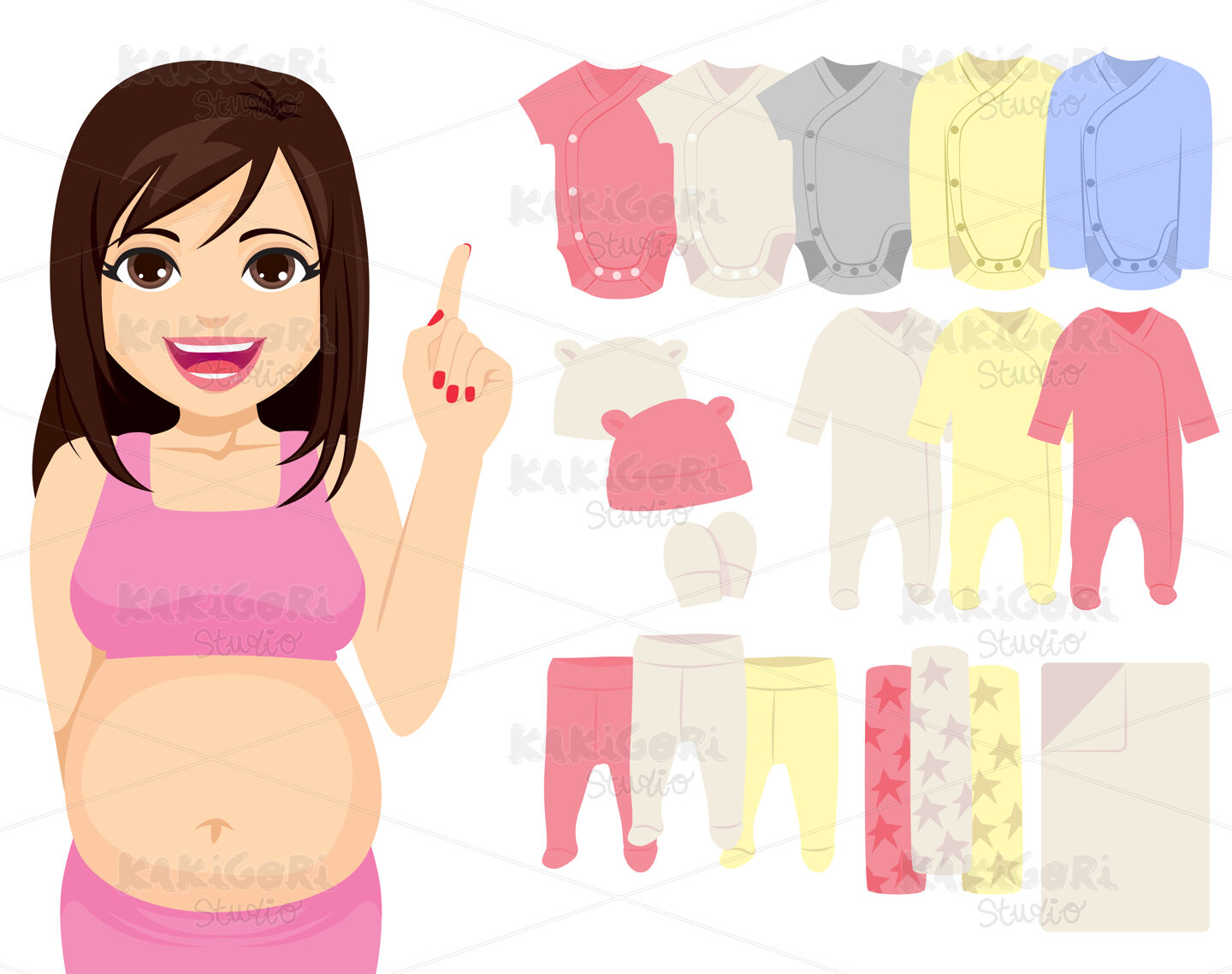 Beautiful young pregnant woman recommends baby essentials clothing for newborn