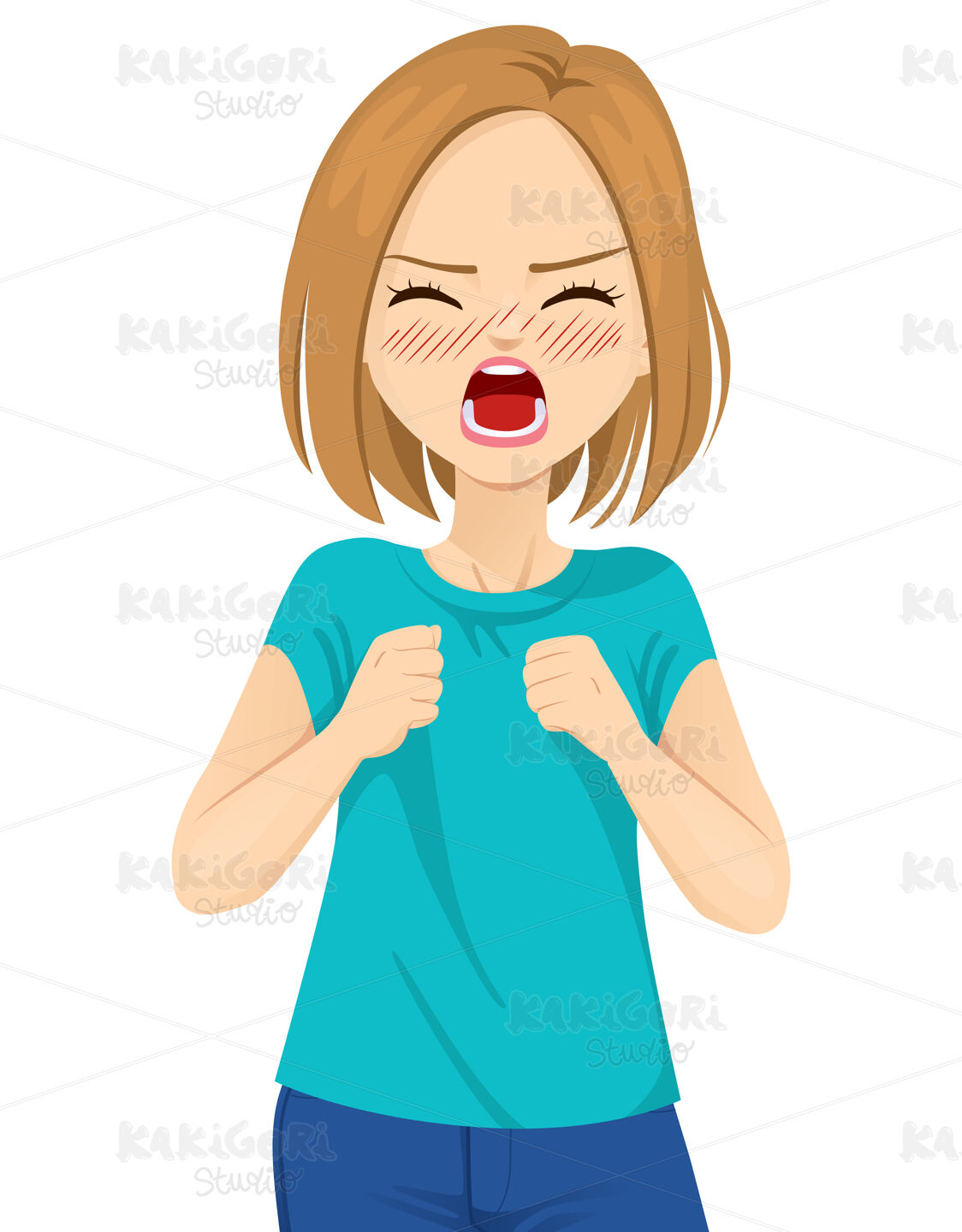 Angry young woman screaming with wild open mouth and closed fists on white background