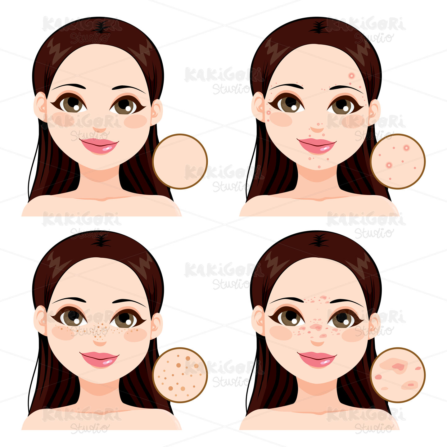 Young woman showing the effects different skin health problems compared to clean skin and freckles