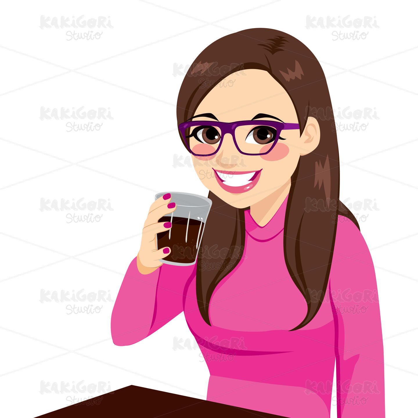 Beautiful brunette young woman with glasses smiling holding drink glass sitting on table