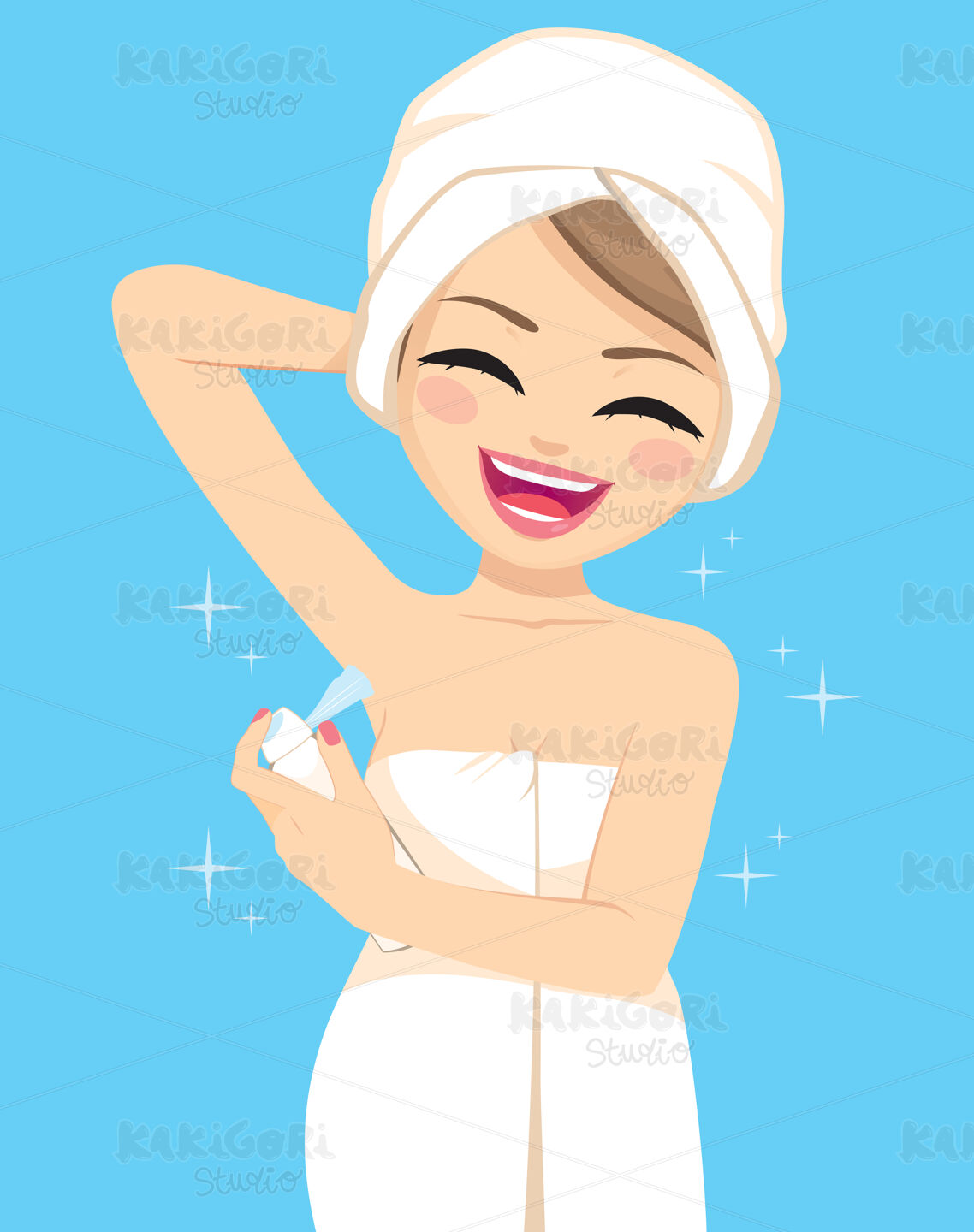 Happy young woman wearing white towel on head and body using deodorant spray after shower