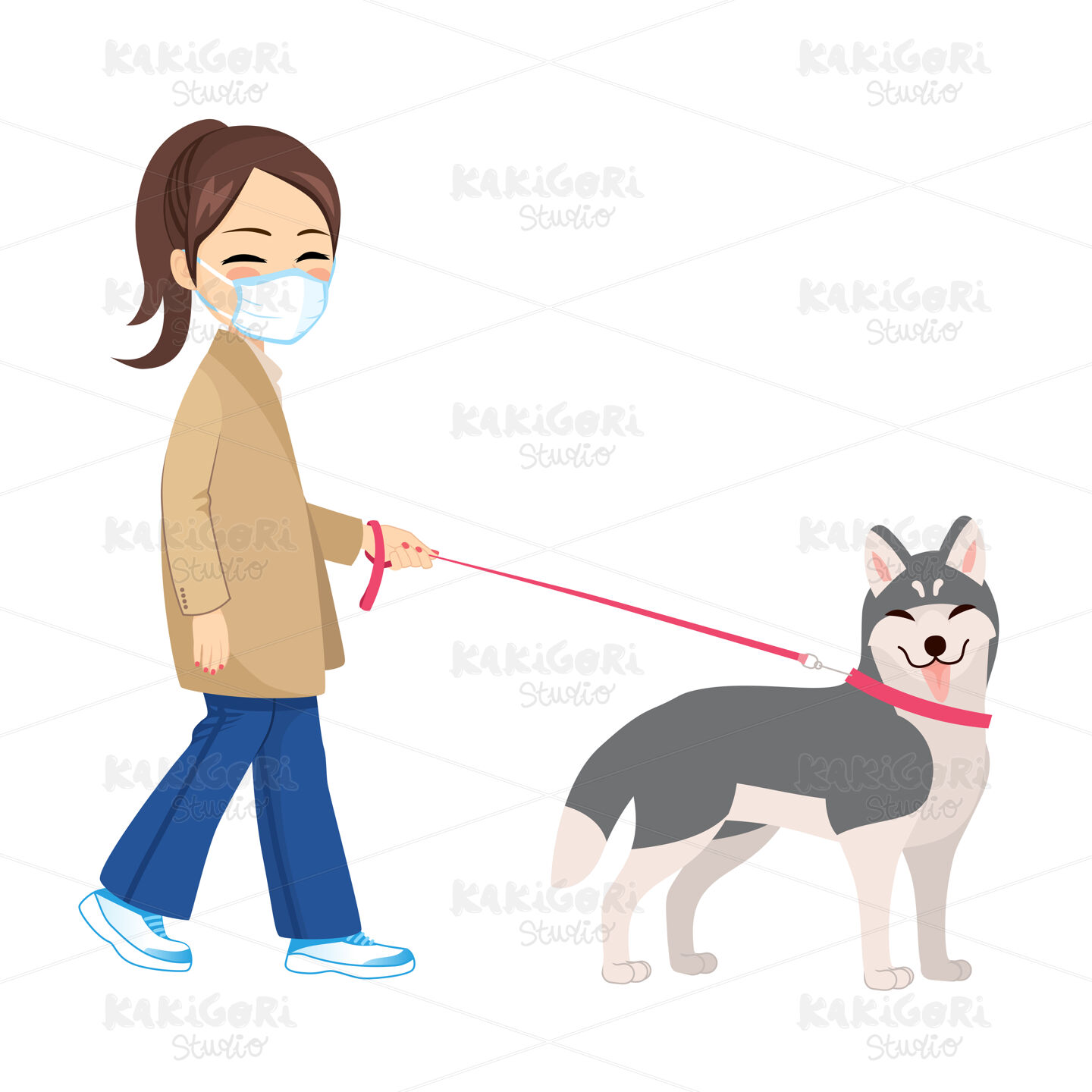 / Woman Walking Dog Medical Mask Clipart Vector Illustration 05215