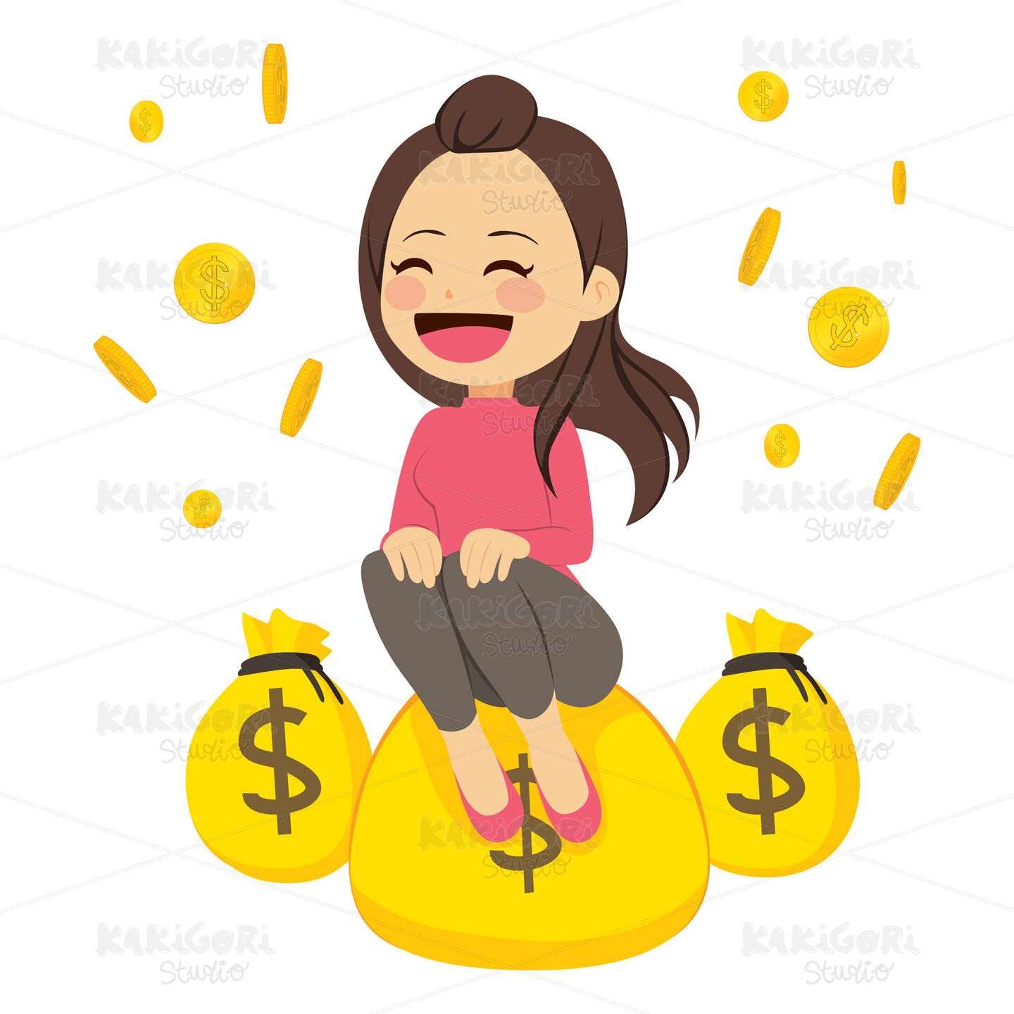Young beautiful successful woman with happy face expression sitting on big money bag in casual clothes while coins fall