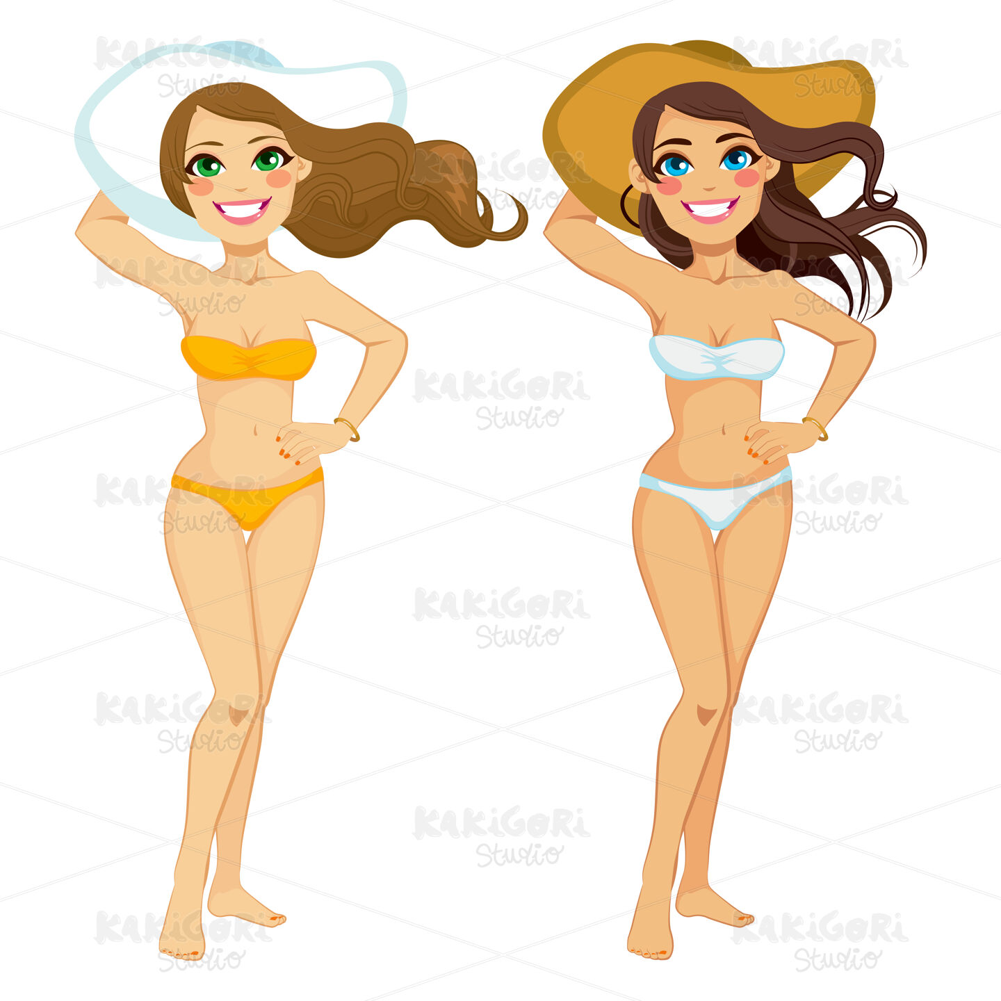 Two beautiful women posing with hand on hip wearing hat and bikini of different color style