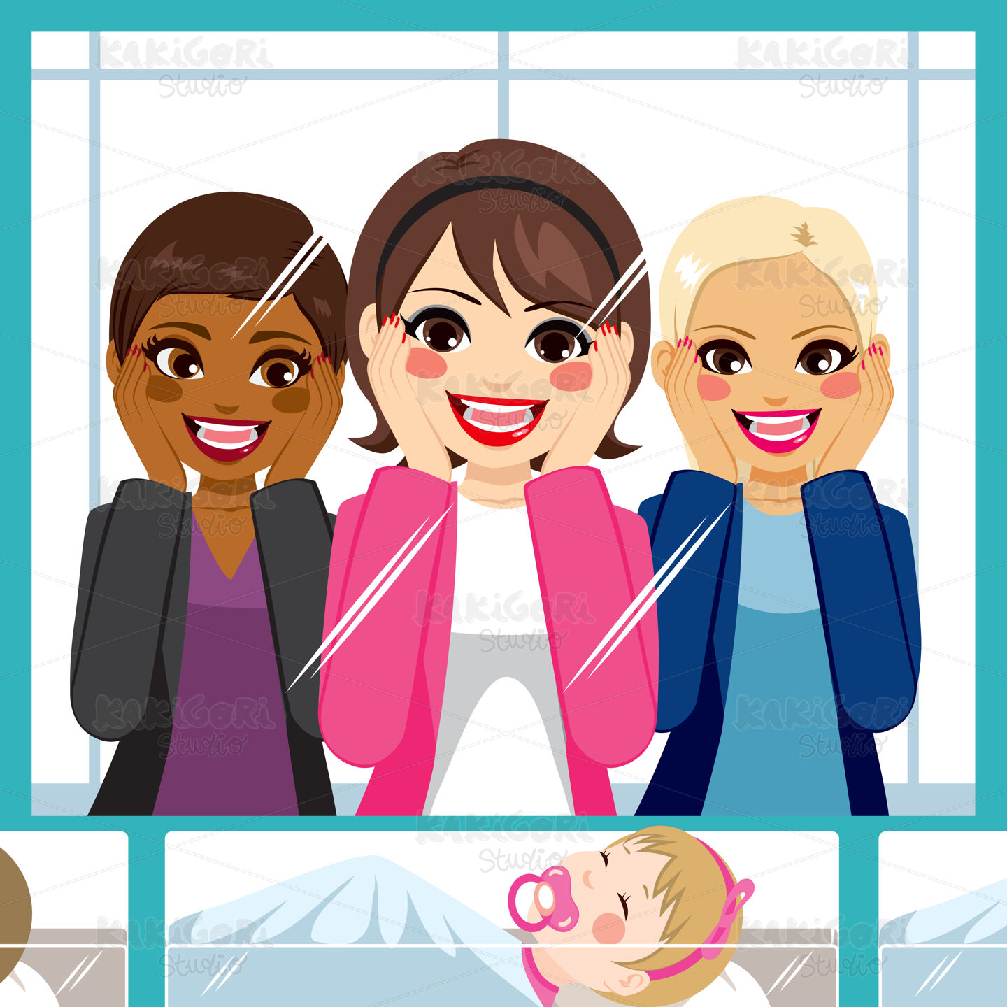 Small group of women admiring newborn baby resting on maternity hospital