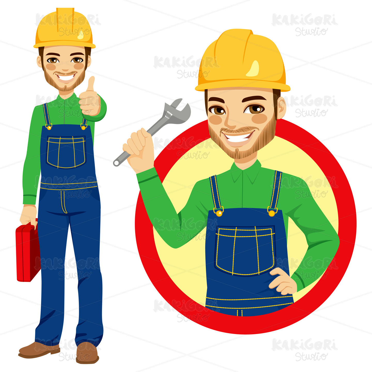 Happy smiling worker holding adjustable wrench wearing blue overall uniform holding tool box and making positive thumbs up hand sign expression