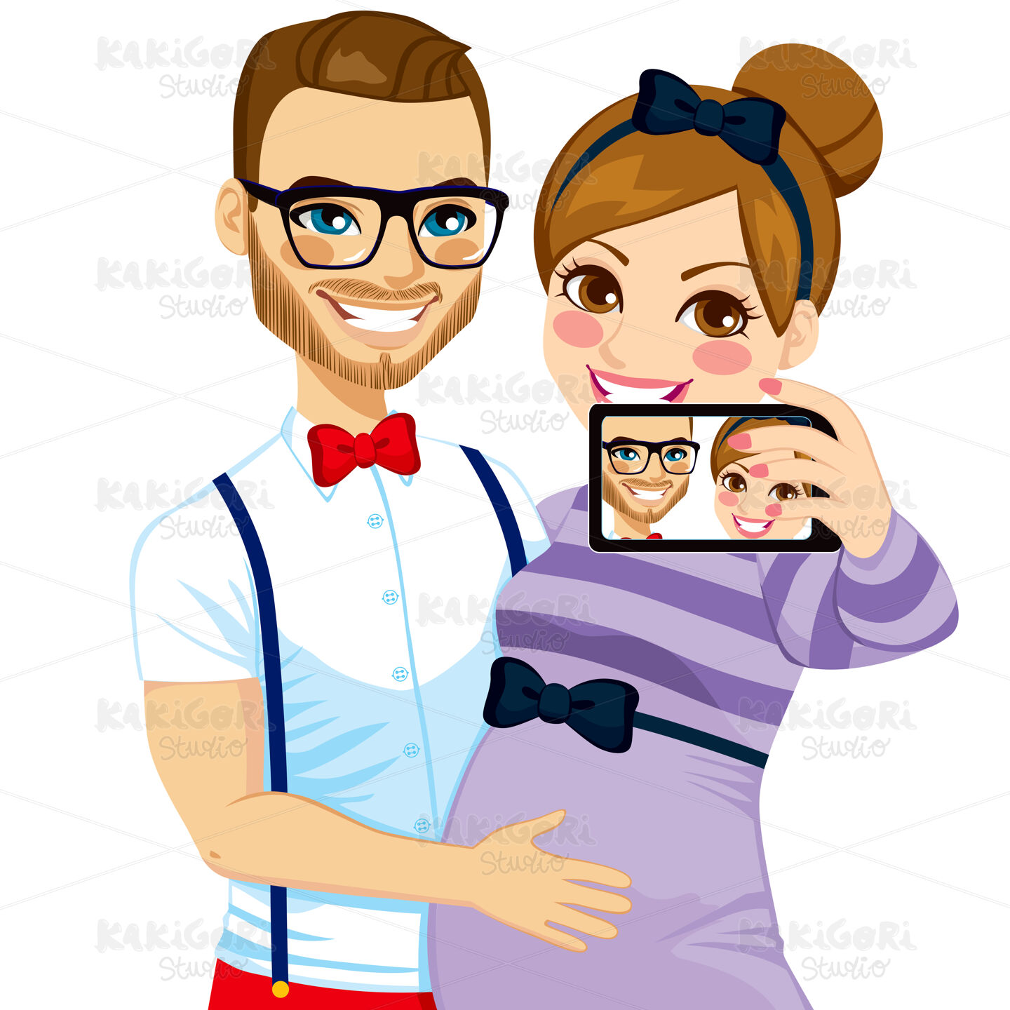 Young hipster husband touching the belly of his pregnant hipster wife while making selfie photo