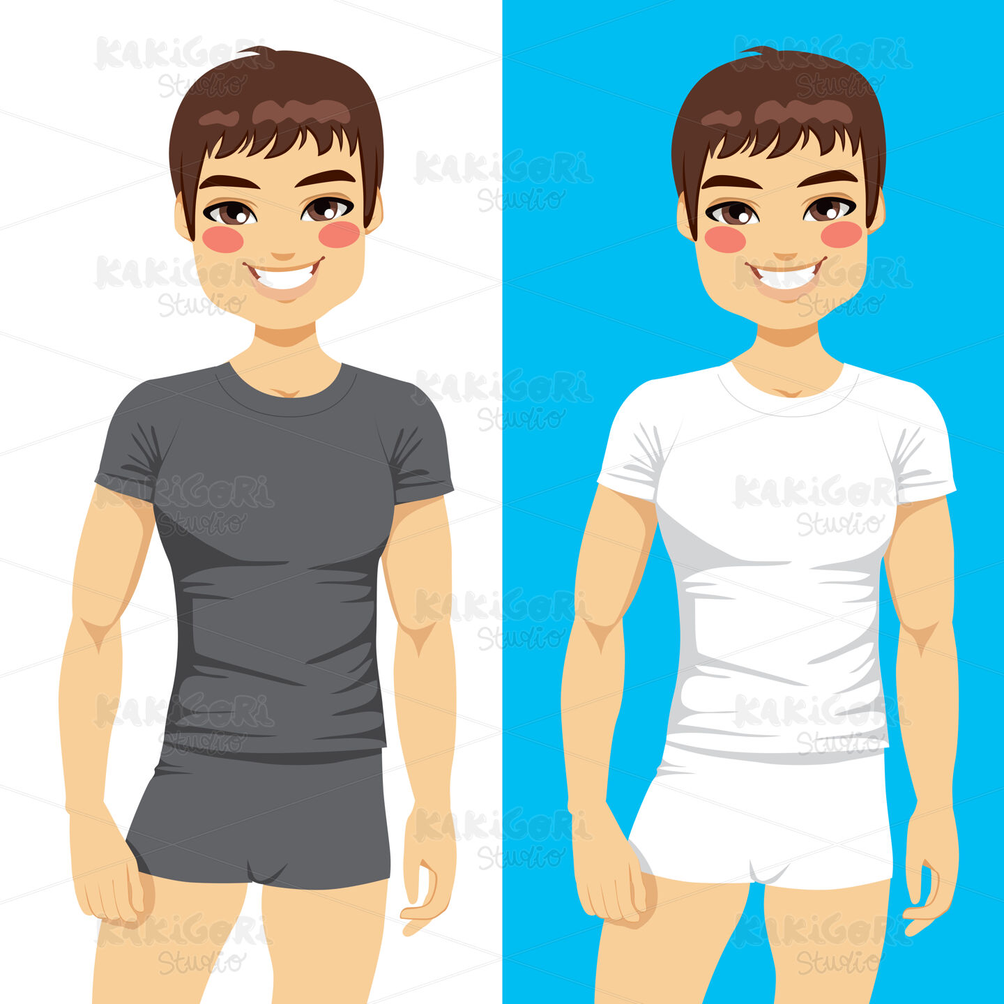 Young man wearing white and gray interior shirt and boxer underwear isolated on white and blue background